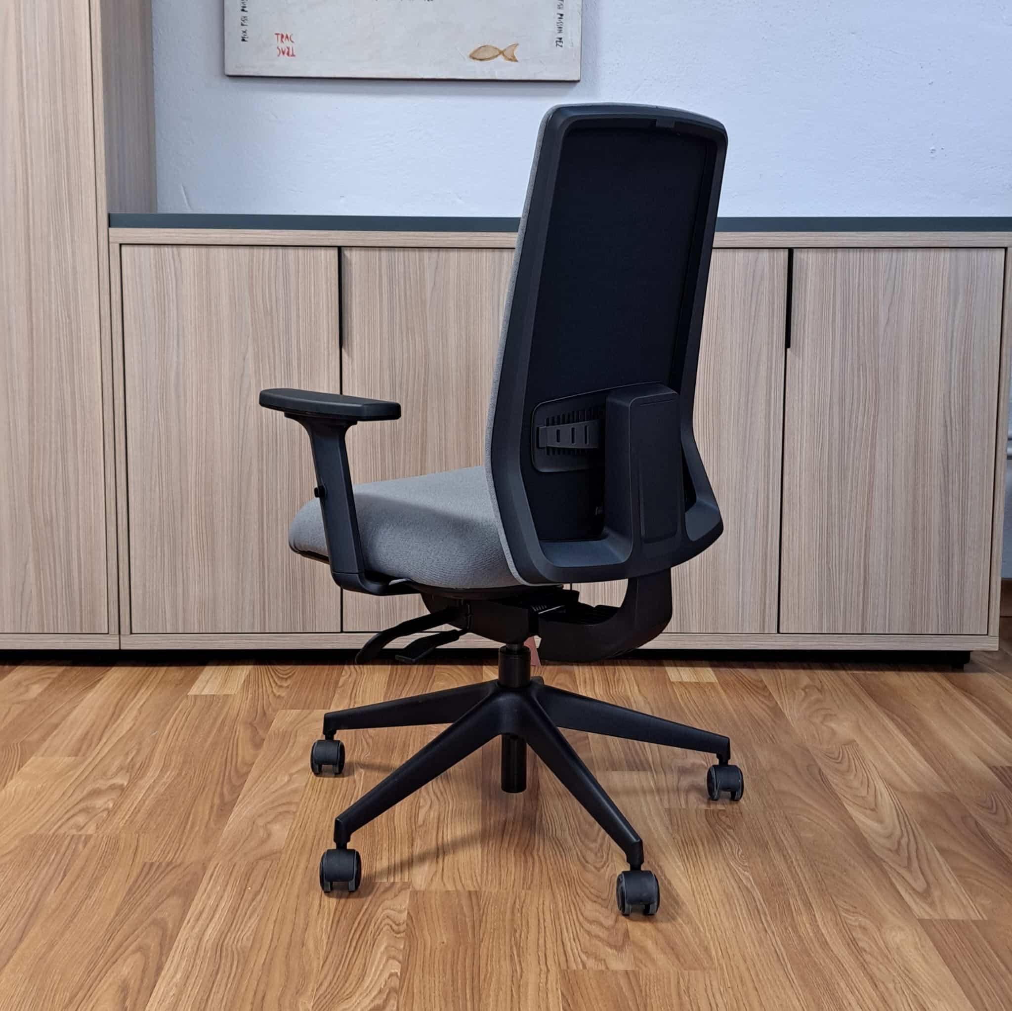 - Backrest in black breathable 3D mesh, upholstered in grey fabric (SEA GRIS), with depth-adjustable lumbar support. Height adjustable by means of a zip (up-down system).